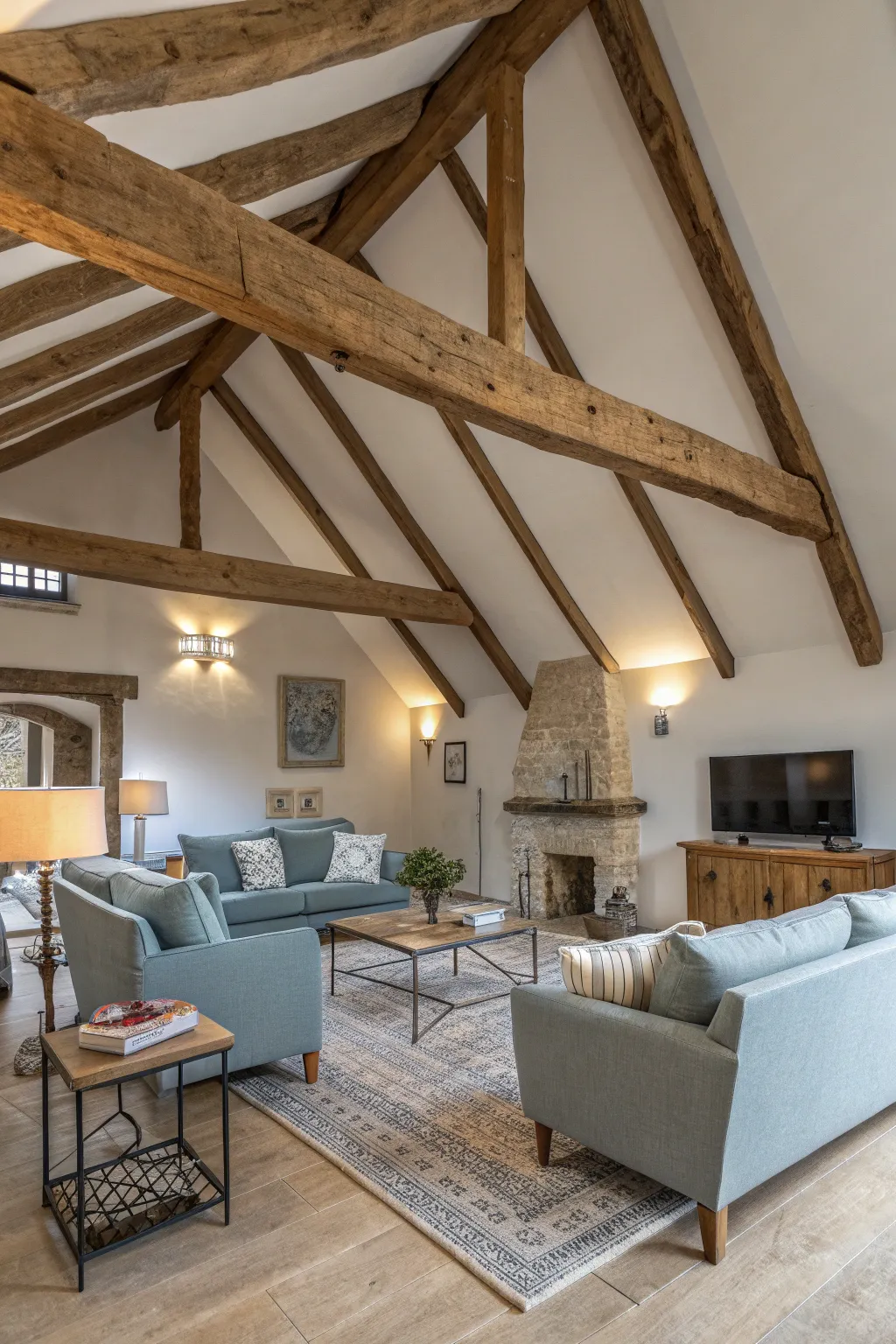 Mix rustic beams with modern furniture for a balanced aesthetic. This juxtaposition is one of my favorite ways to blend styles.