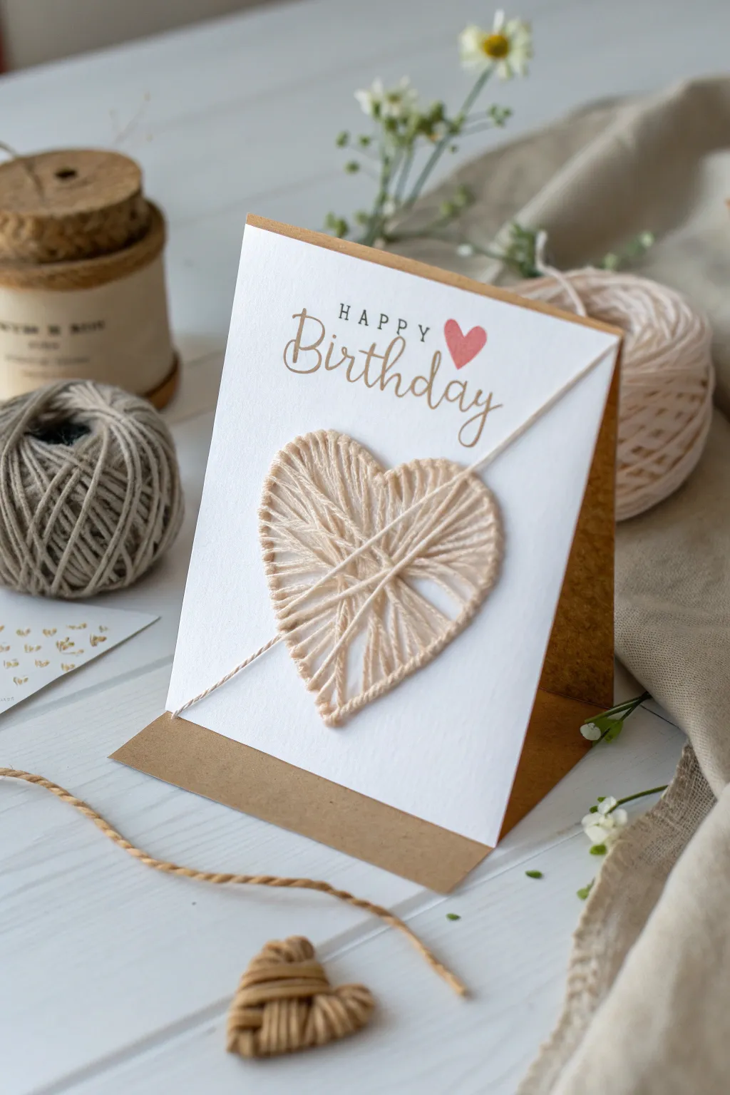 Use yarn to create a string heart on your card. I find this tactile craft perfect for conveying love and warmth.