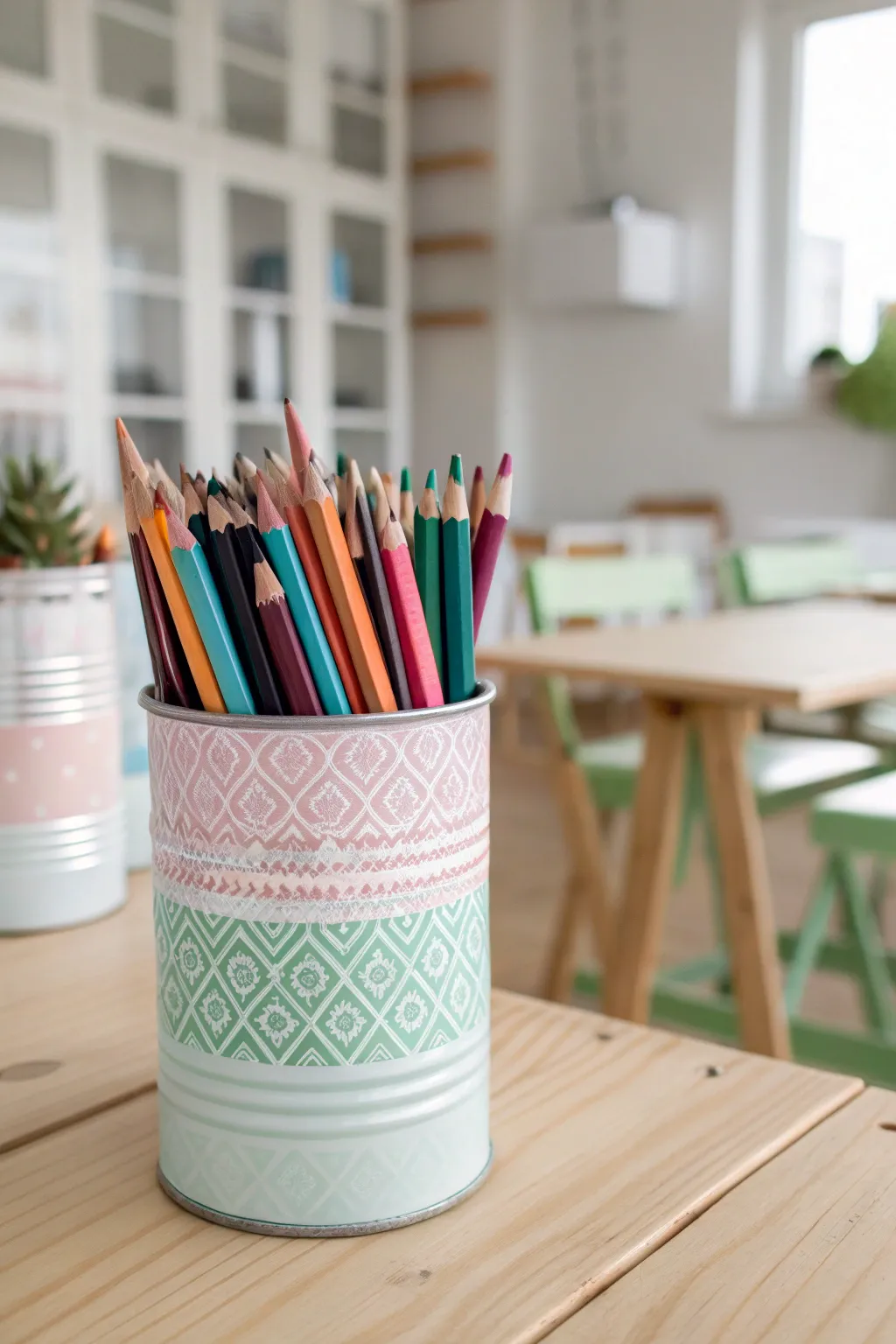 Transform old tin cans into pencil holders or paintbrush organizers. A bit of decorative paper or paint gives them new life and adds a splash of color to your desks.