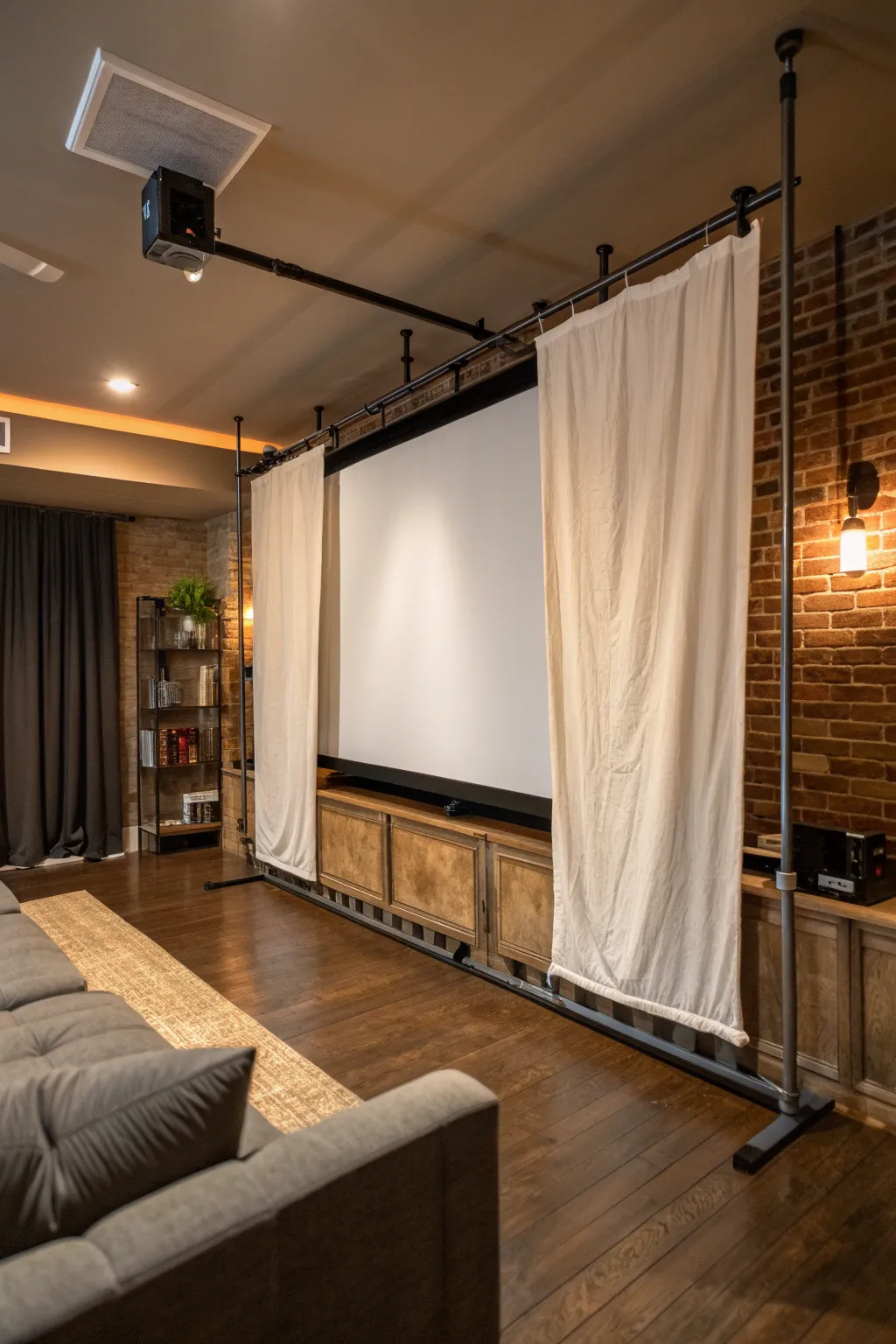 Hang a screen from a curtain rod for easy adjustment. This method fits right into my flexible living area, adapting to different viewing needs effortlessly.