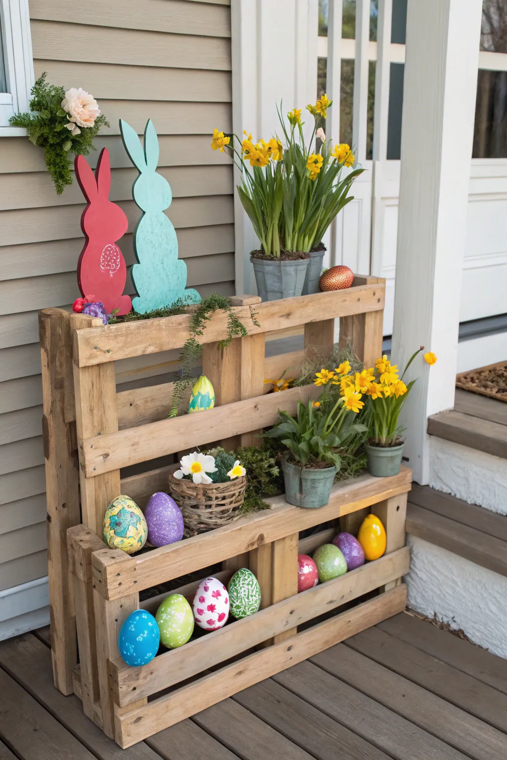 Create a porch display using pallets stacked to various heights, adorned with eggs, bunnies, and spring flowers. It’s a great way to add curb appeal during the Easter season.