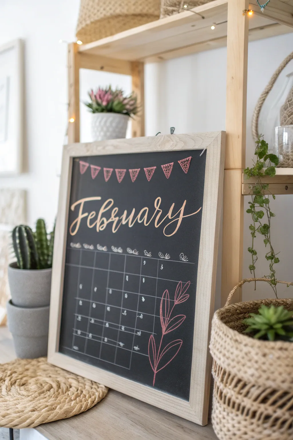 Embrace February's warmth and love with a cozy, handcrafted chalk calendar that brings simplicity and elegance to your space.