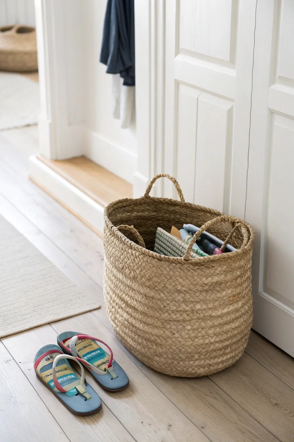 • Woven Rope Basket with Handles: Combine style and functionality for easy flip flop storage in any room.