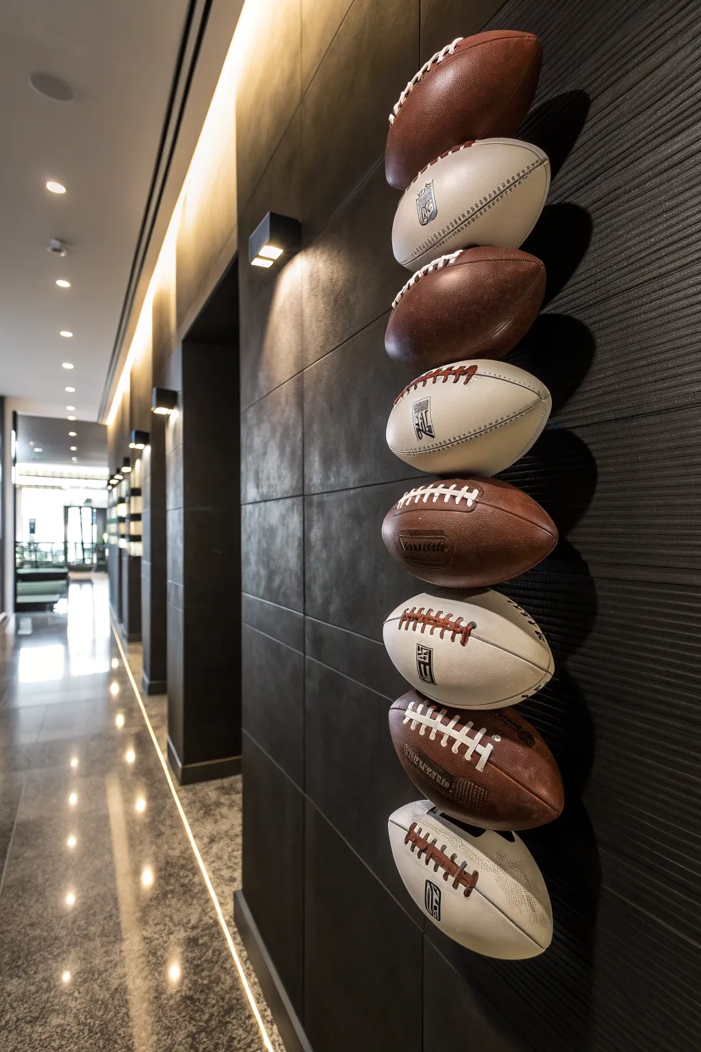 Showcase your family’s football stories with a vertical arrangement of mounts. I included custom plaques for each ball, turning our hallway into a cherished memory lane.