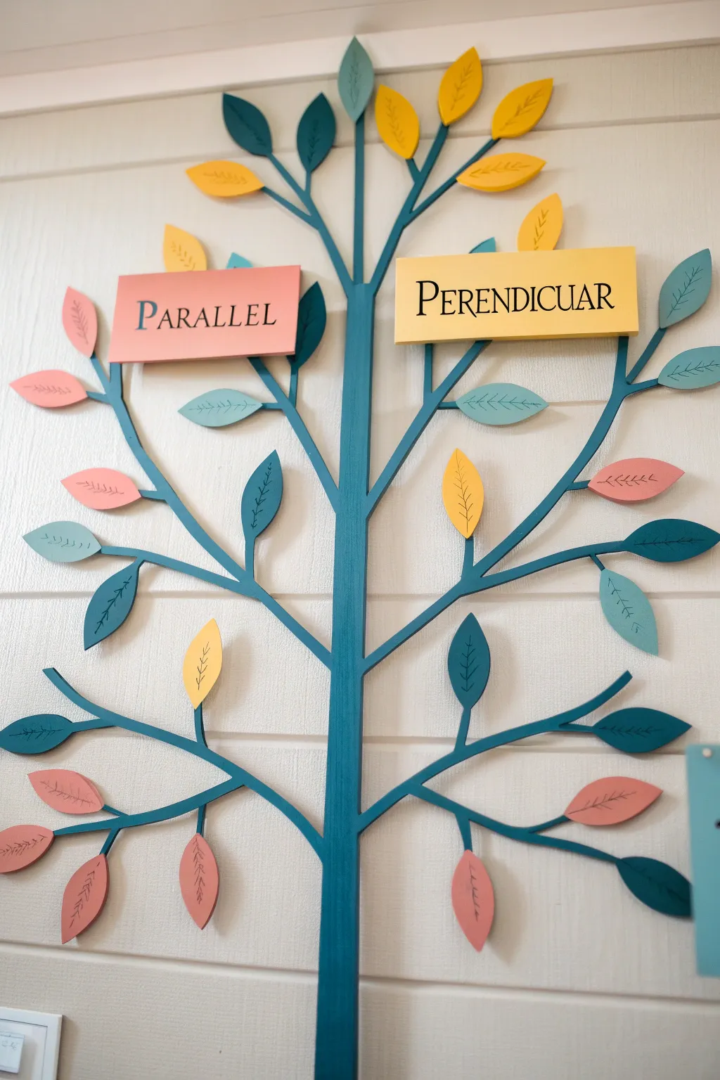Create a tree with branches representing different geometric concepts. Add leaves with terms like ‘parallel’ and ‘perpendicular’, inviting students to pick and explore them.