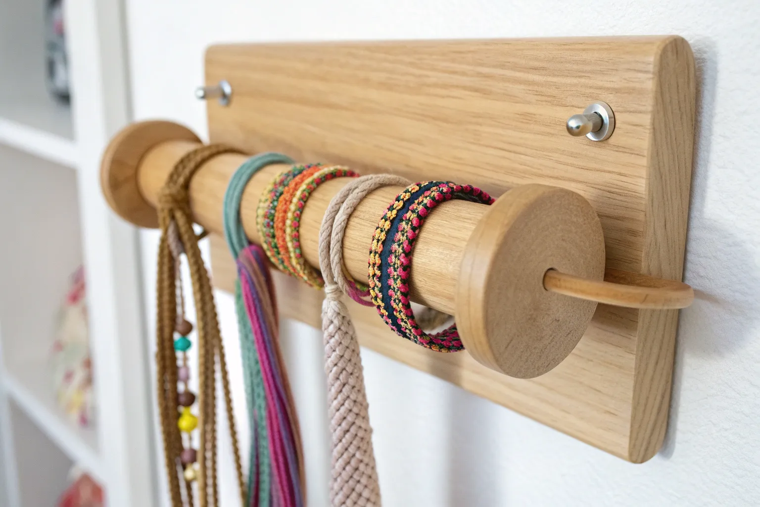- Wooden Thread Spindle: Organize your hair ties efficiently with this elegant wooden thread spindle. Keep them tidy!