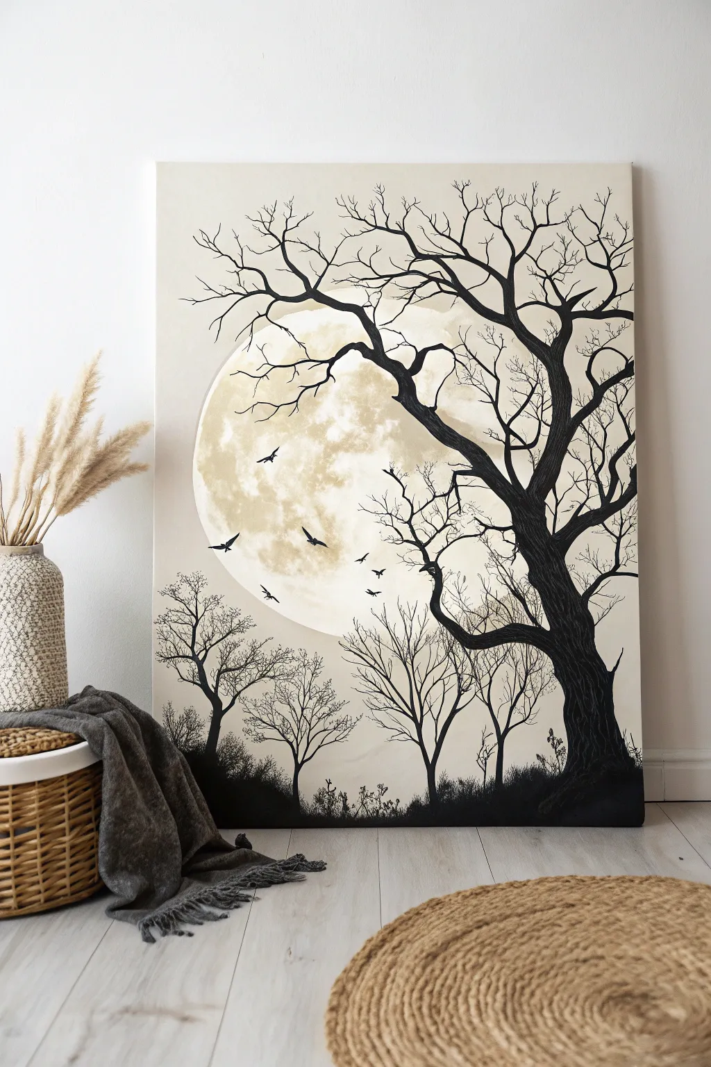 Embrace the mysterious allure of moonlit trees with this minimalist masterpiece.