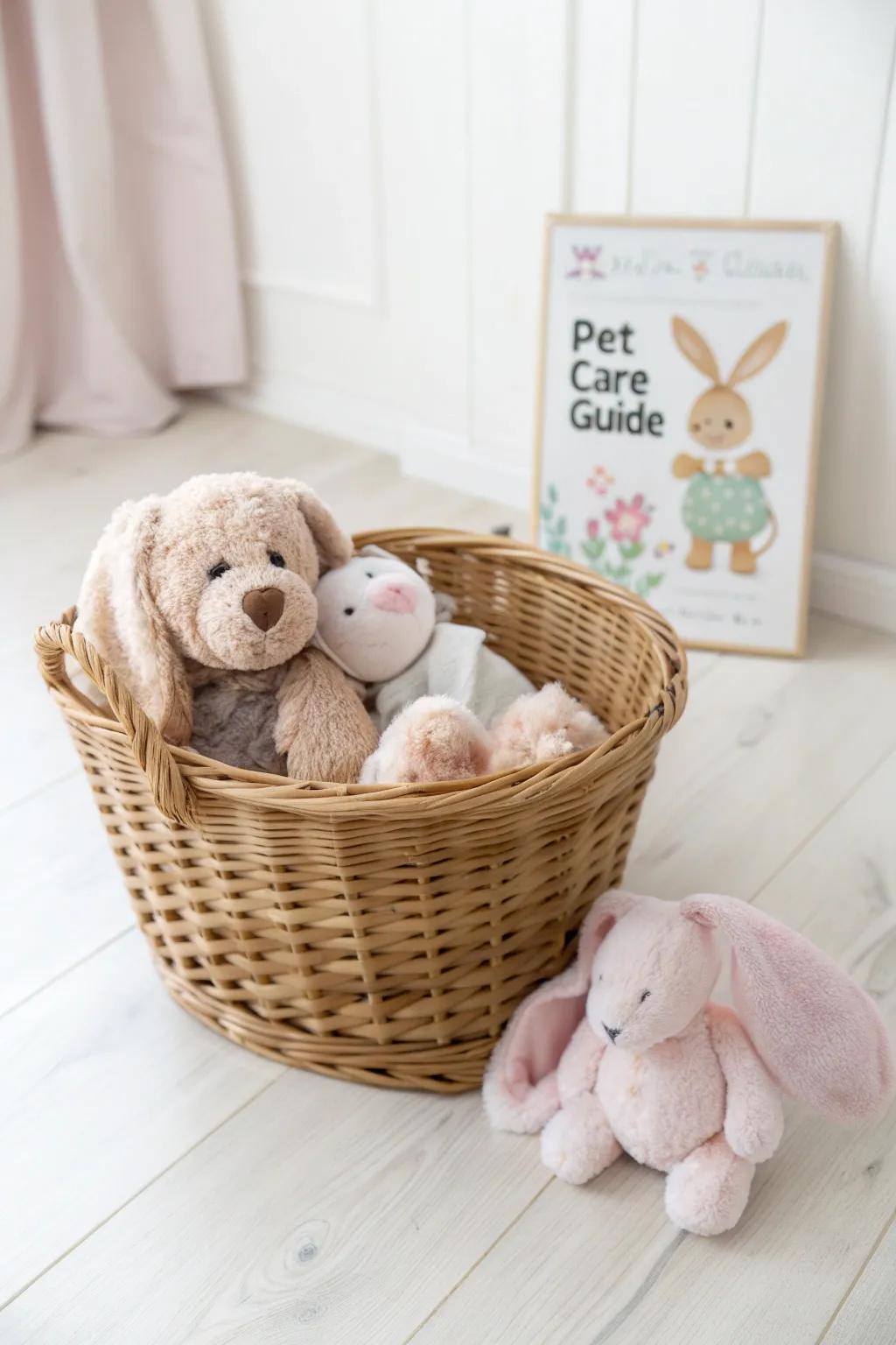 Include stuffed animals and a pet care guide for little animal enthusiasts. My younger self would have adored a basket like this, dreaming of all the pets I’d have one day.