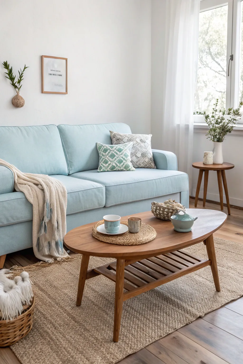 Add bohemian touches like woven baskets or macramé wall hangings to introduce a relaxed, eclectic vibe. This style complements the softness of the light blue couch beautifully.