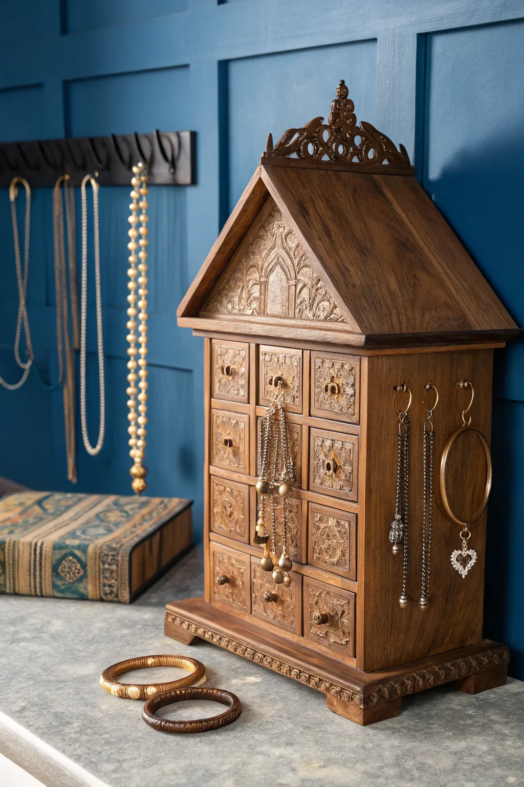 Design a longhouse as a jewelry holder with hooks and compartments. It’s a stylish way to blend fashion with a touch of history.