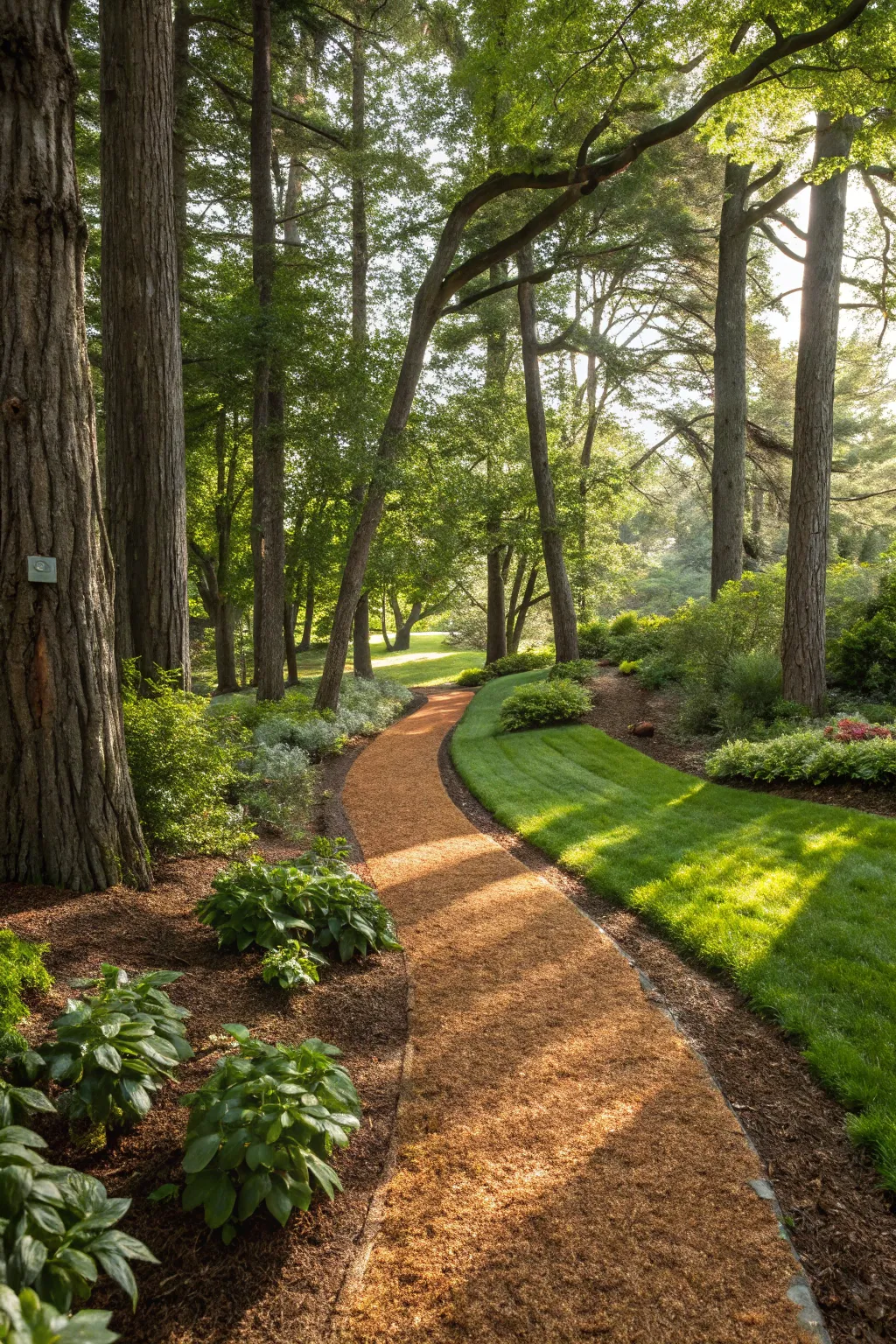 Design mulch paths that wind around your trees. Not only do they look charming, but they also guide visitors through your garden space.