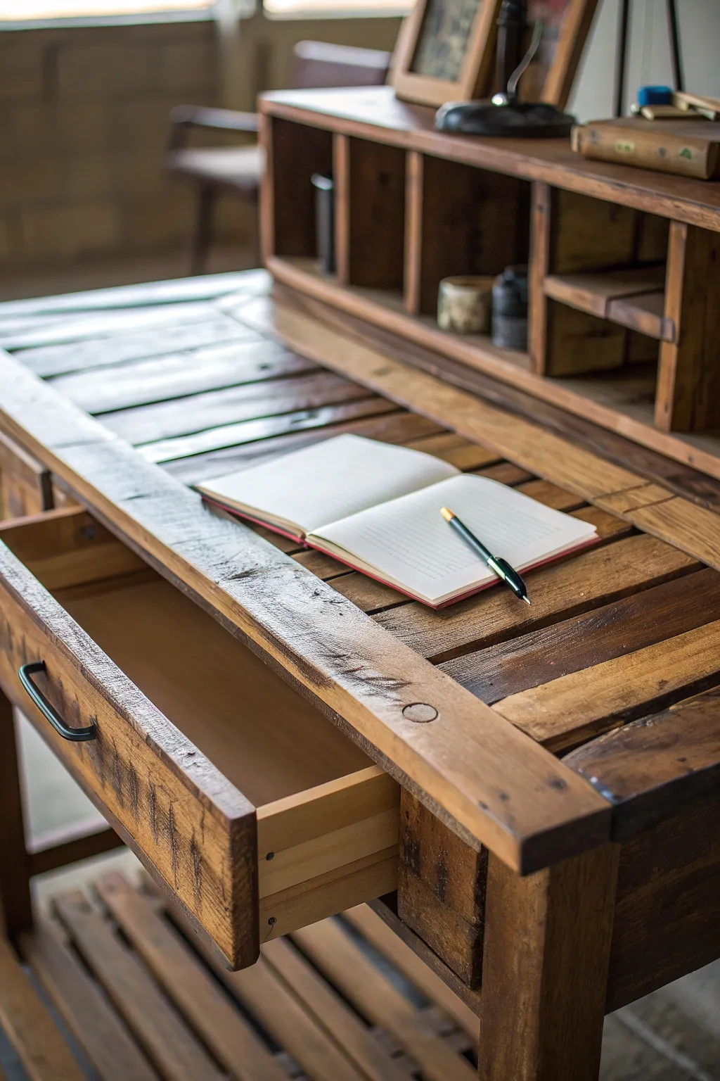 For the secretive at heart, a pallet desk with hidden compartments offers a nifty way to store valuables or unsightly clutter.