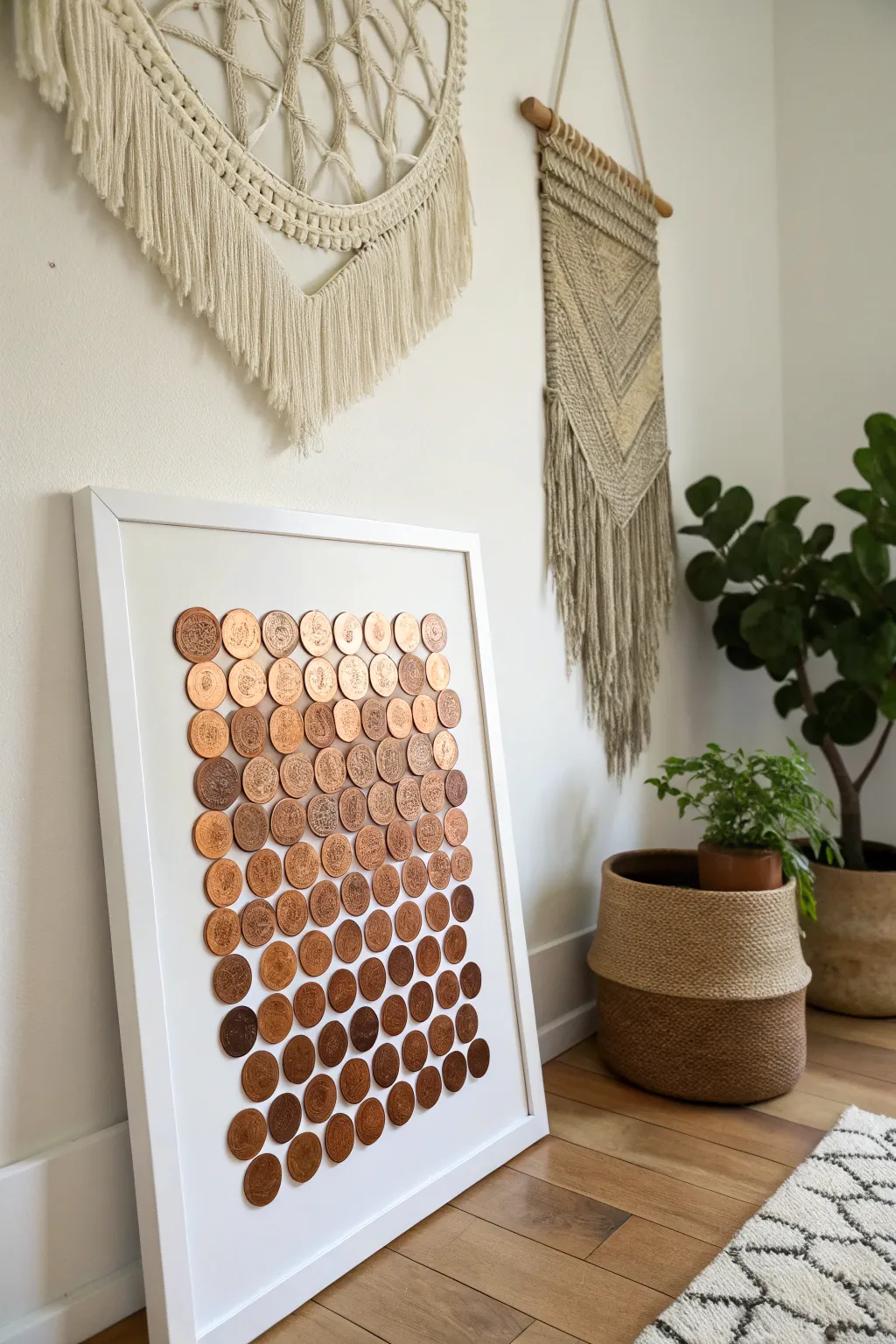 Arrange pennies in a pattern for stunning wall art. My penny starburst design is a favorite among visitors.