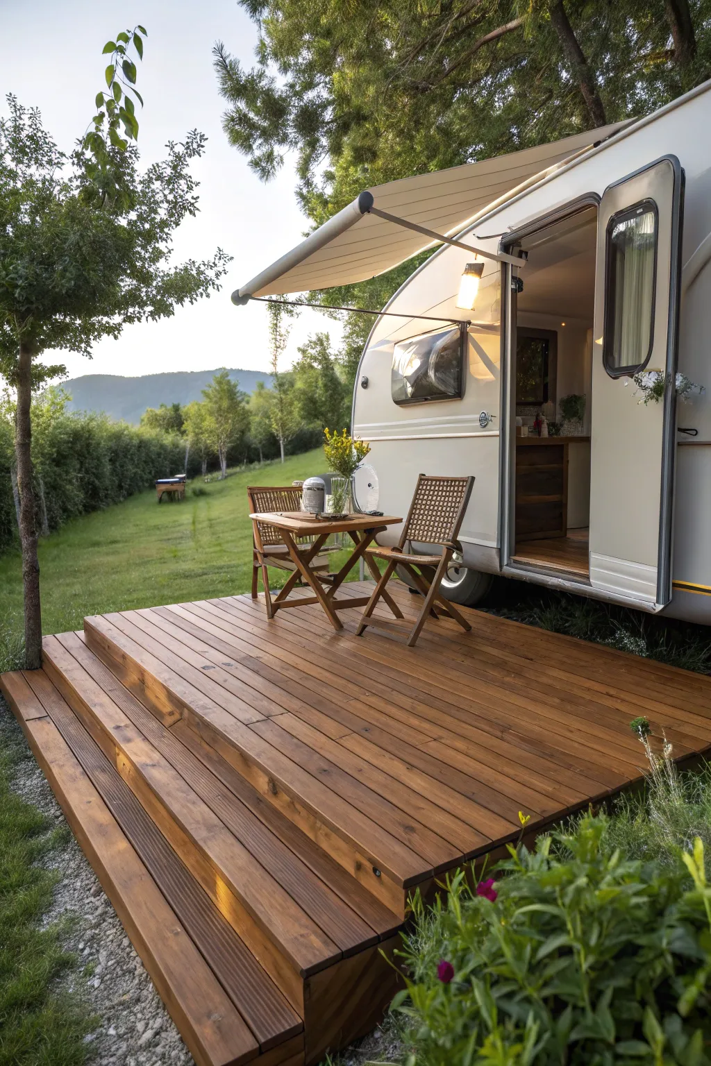 Imagine stepping out of your camper onto a spacious wooden deck, perfect for morning coffee or sunset views. A sturdy deck not only expands your living area but also adds a warm, inviting touch to your camper setup.