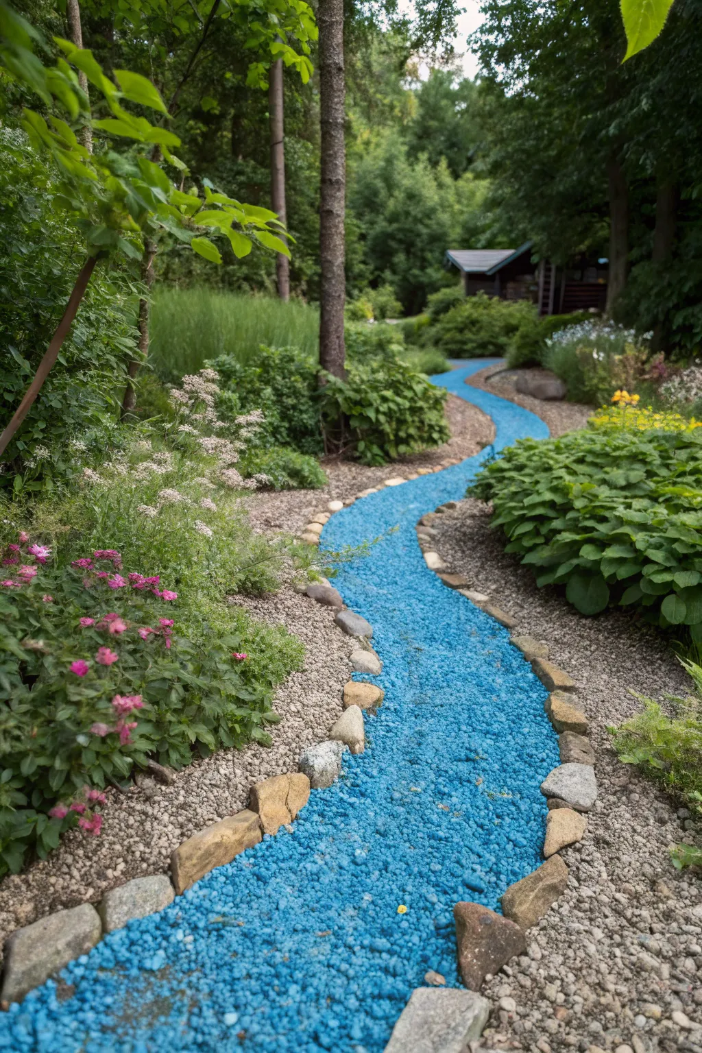 Transform your garden with a vibrant splash of color using bright blue gravel for a playful and stylish path.
