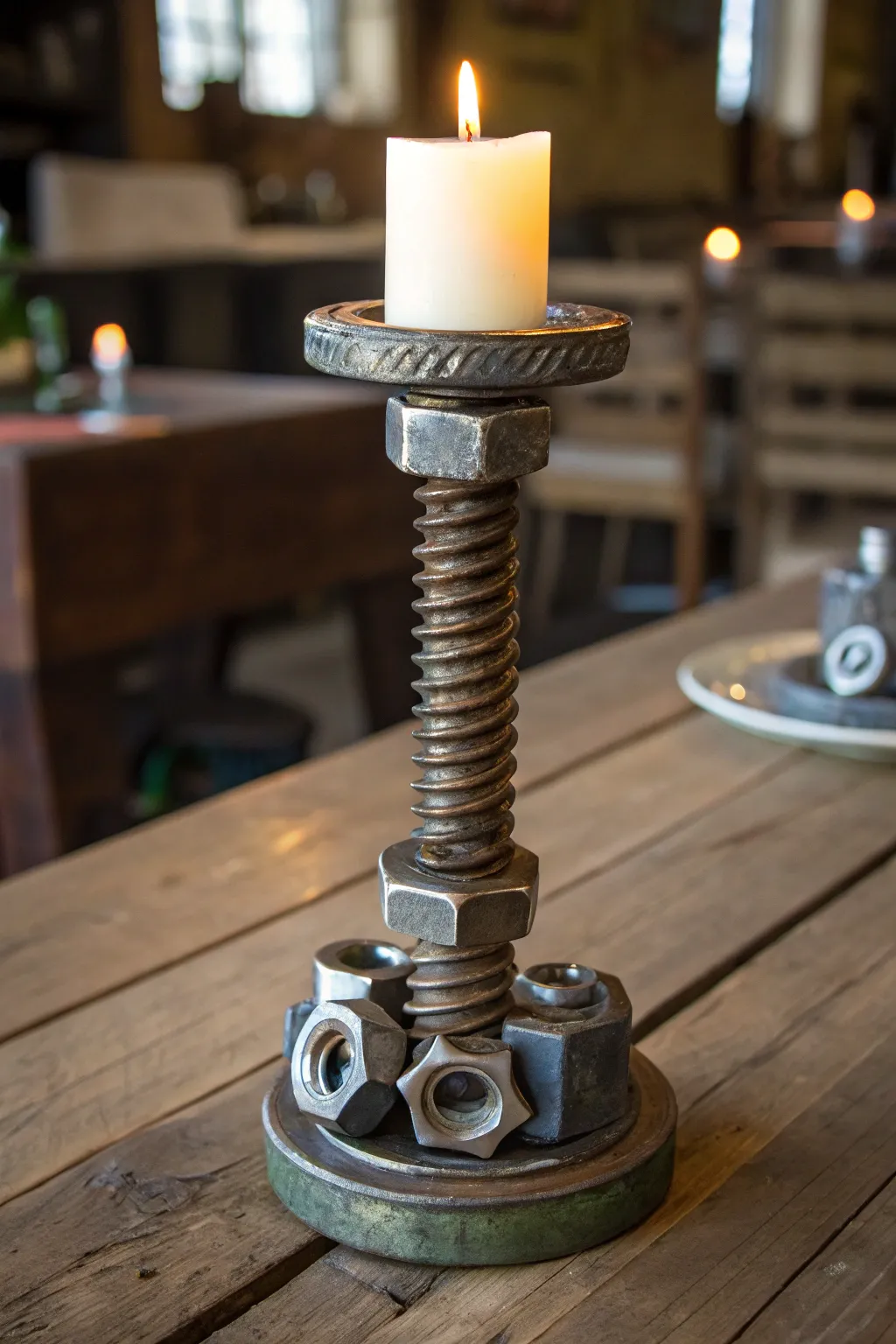 Create candle holders from nuts and bolts for a cozy, industrial look. They cast such a warm glow during my evening downtime.