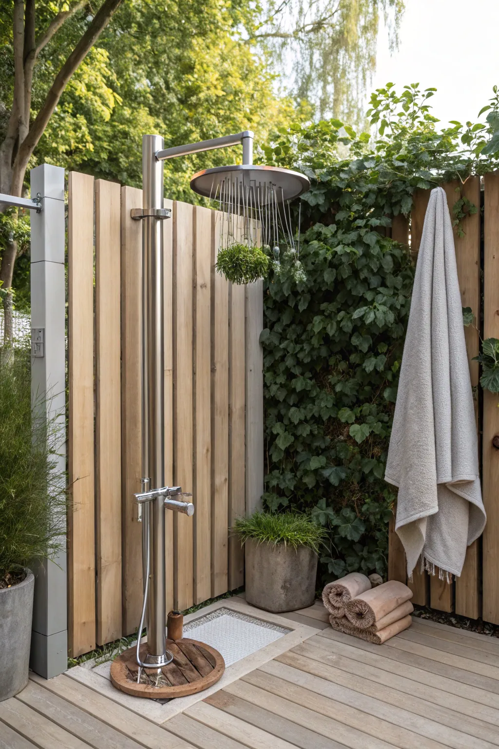 Elevate your camping experience with a touch of luxury: an elegant outdoor shower blending Scandinavian simplicity with Boho charm.