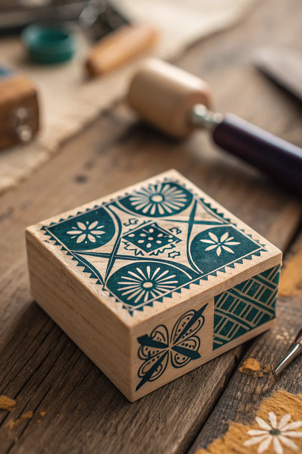 Create unique stamped designs on wood blocks using foam and ink. This is a technique I love for adding texture and interest to my projects.
