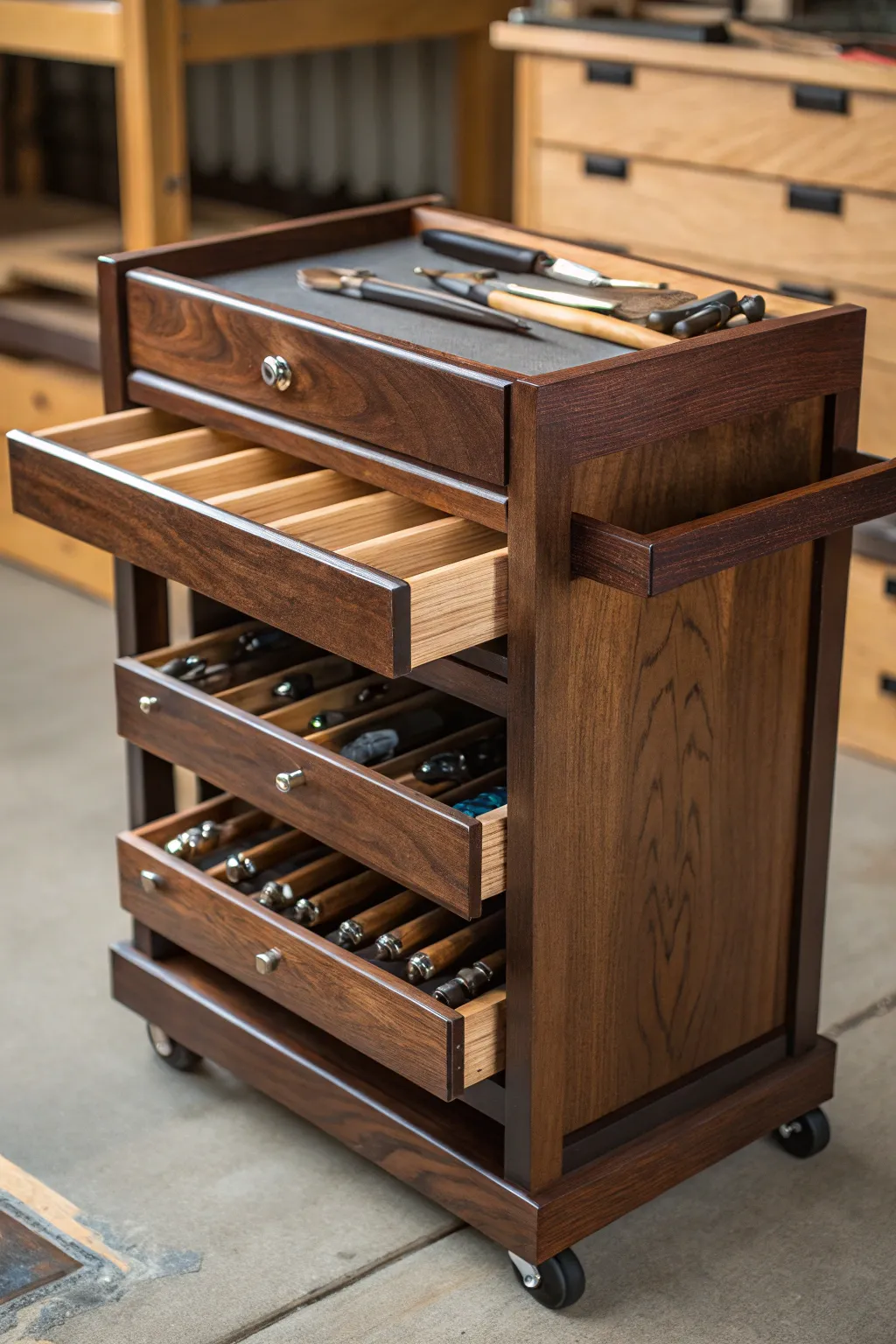 Keep your tools tidy with a cart featuring multiple drawer compartments. I once made each drawer dedicated to a specific tool type, and it made finding things a breeze!