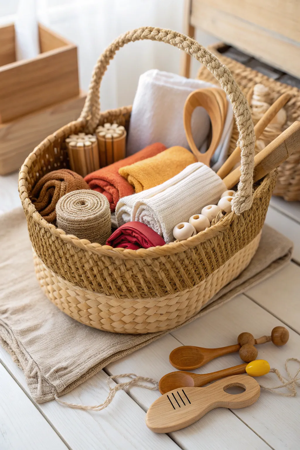 Curate a basket with eco-friendly items like bamboo utensils and cotton cloths. It’s never too early to introduce sustainable materials to the little ones.