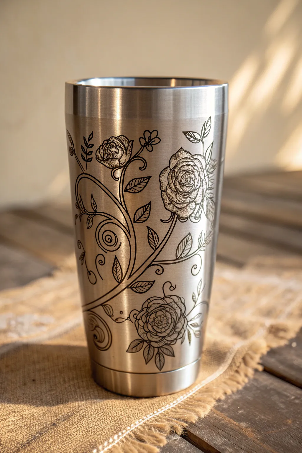 Bring nature to life on your tumbler with floral engravings. I once transformed a plain tumbler into a blooming masterpiece with delicate roses and vines.