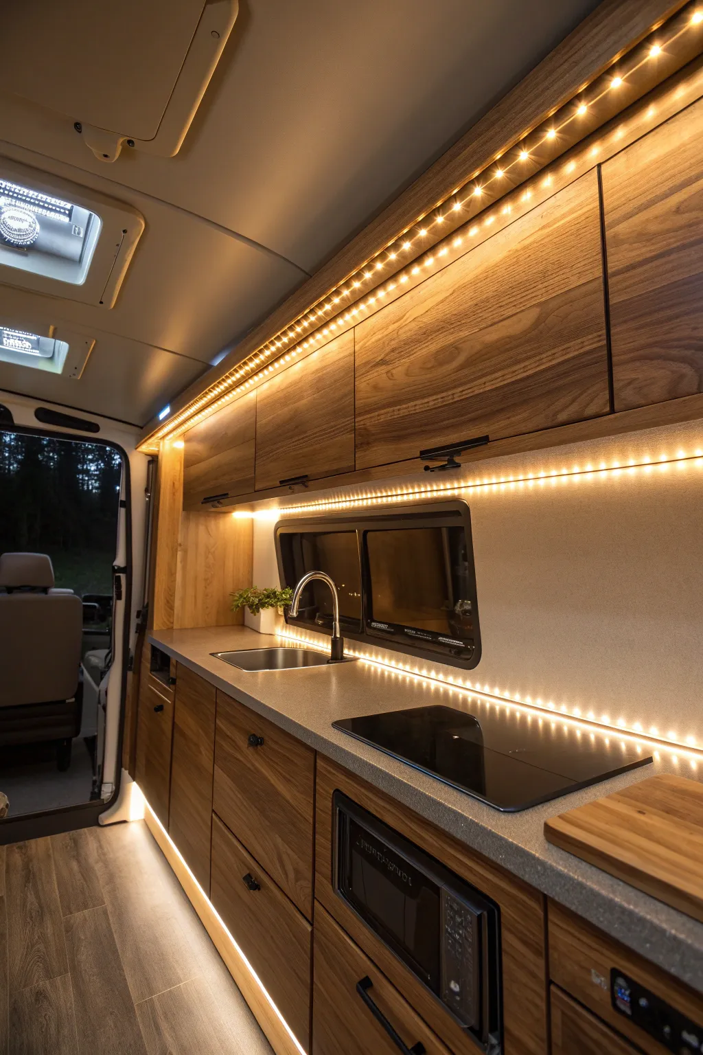 Under-cabinet lighting not only brightens your workspace but also adds depth to your van’s interior. It’s a simple addition that can really change the vibe of your mobile kitchen.