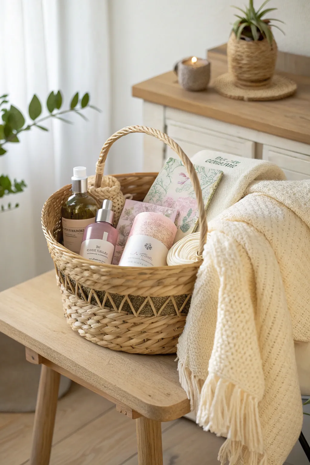 Fill a basket with lotions, face masks, and a cozy blanket to encourage a day of pampering and relaxation.