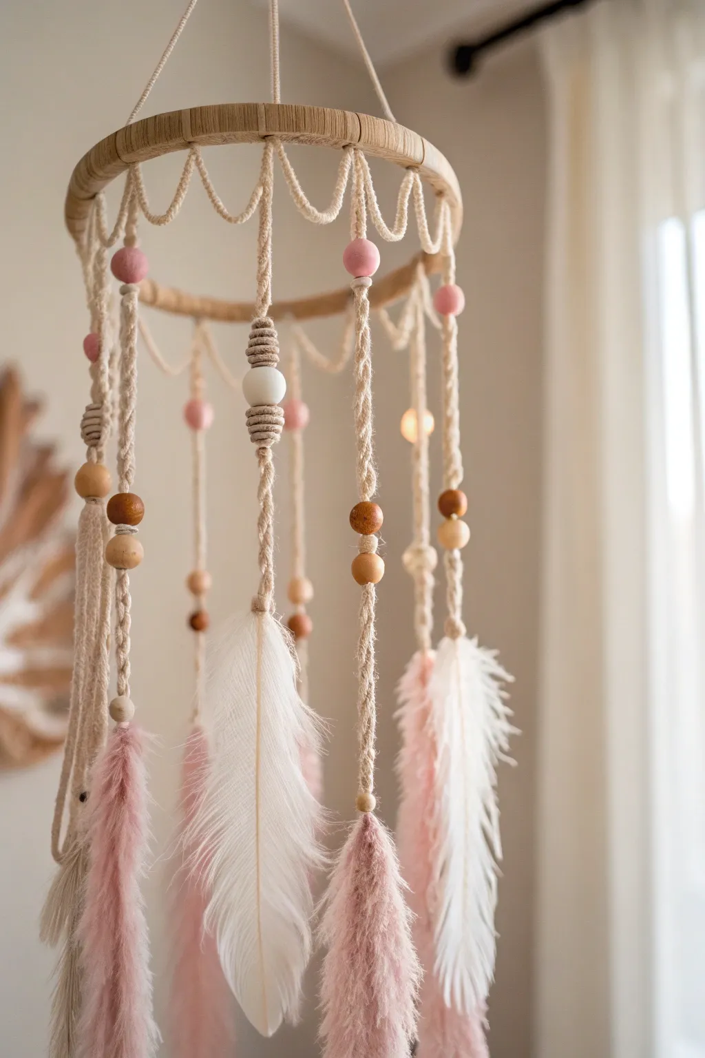Craft a yarn mobile that drifts gently with the breeze. It’s a whimsical addition above a bed or in a nursery.